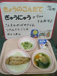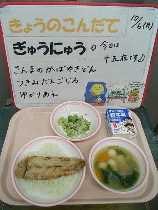 秋らしく涼しい朝になりました。今日は「十五夜」です。十五夜はこれから始まる秋の収穫を前に、その年に最初に実った作物を神様にささげる初穂祭の意味合いがあります。そのため、十五夜には、たわわに実った稲穂に見立てたすすきを飾り、里芋や団子をお供えする習慣があります。今日は秋に旬を迎える魚の代表「さんま」のかば焼き丼にあわせて、白玉を月に見立てた月見団子汁にしました。夜にはきれいなお月様がみえるといいですね。