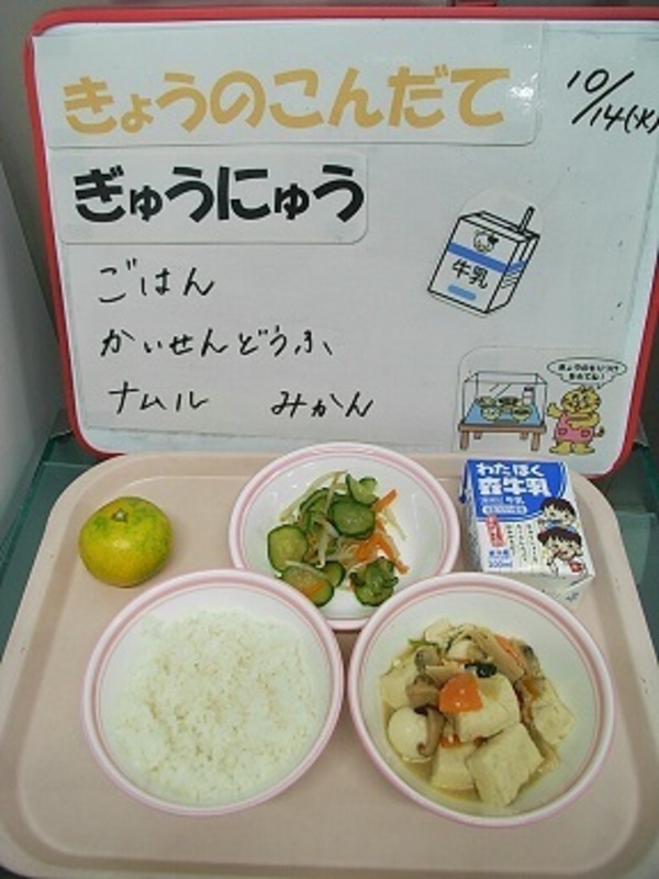 給食にもよく登場する豆腐。大豆をしぼってできた豆乳に、にがりを加えて固めたものです。一度固まった豆腐を別の型に移し、水気を少しきったものが「木綿豆腐」、豆乳の少し濃いものをそのまま固めたものが「絹ごし豆腐」です。給食では、木綿豆腐の水気をさらにきった「押豆腐」を使います。水気が少ないので炒めたり煮たりしても崩れにくいのが特徴です。きれいに仕上げるために、給食では切った後さらに一度ゆでてから使っています。今日はえびやいかなどの魚介類と一緒に中華味の煮物にしました。