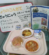 今日は、「図書館祭り」の給食コラボ第4弾です。今日は「ススメ おにぎりコロコロ その二 野菜の巻」より、「マカロニグラタン」と「ミネストローネ」です。みならい忍者のおにぎりんくんが、青い野菜について知るための修行に出るお話です。今日は、岩槻小初登場!給食室でひとつひとつ手作りしたマカロニグラタンと、野菜がたっぷりはいったミネストローネを、はちみつの香りがするはちみつパンと一緒に味わって食べてくださいね。次に本についての紹介を図書委員さんお願いします。