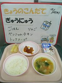 今日は岩槻小学校一番人気の「ヤンニョムチキン」です。ヤンニョムチキンは、韓国の甘辛いフライドチキンで、デリバリーやファーストフードとしてよく食べられています。ヤンニョムとは、韓国語で調味料のことです。給食ではコチュジャン、トマトケチャップ、しょうゆ、砂糖、ごま油を使い、にんにくを効かせたタレにしました。韓国の丸い形をした、おもち「トック」をたくさんいれた「トックスープ」と一緒にたくさん食べてくださいね。