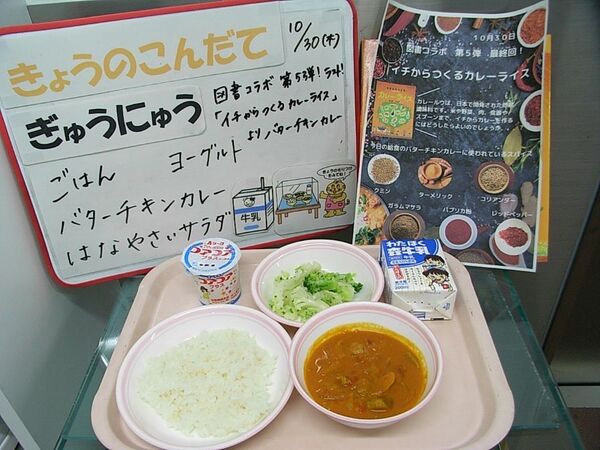 今日は、「図書館祭り」の給食コラボ第5弾、最終回です。今日は「イチからつくる カレーライス」より、「バターチキンカレー」です。カレーライスに使われる、米や肉、野菜、調味料などを、イチから作るにはどうしたらよいのでしょうか。今日は、岩槻小学校の給食でも、カレールウを使わず、クミン、ターメリック、コリアンダー、ガラムマサラ、パプリカ粉、レッドペッパーの6種類のスパイスを使って作りました。スパイスの効いたカレー、味わって食べてくださいね。次に本についての紹介を図書委員さんお願いします。