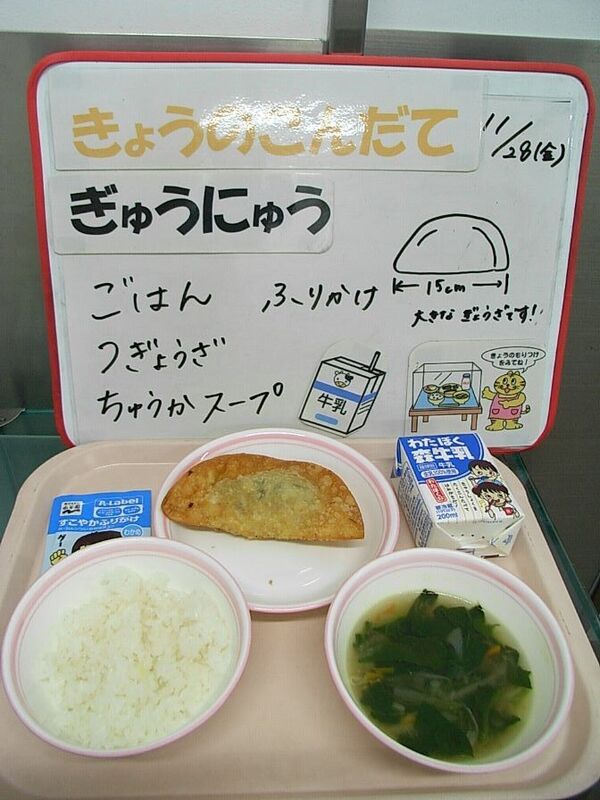 今日は三重県のご当地グルメ「津ぎょうざ」の給食です。1985年ごろの小学校給食が発祥で、現在でも津市民に人気のメニューです。津市の栄養士さんたちによって、栄養のバランスがよく、肉や野菜がたくさんとれて一つで満足感が得られるようにと考えられました。ひとつずつ手作りで作る調理員さんの作業も考えて、直径15cmという特注の大きな皮を使ってインパクトあるぎょうざが誕生したそうです。今日も岩槻小の調理員さん全員で、一つずつ手作りしました。いつもと違うぎょうざ、楽しんで食べてください。