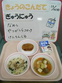 12月に入ってから、寒い日が続いています。こんな季節は、しっかり食べて体の中から温めていきましょう。今日は菜飯が主食の和風の献立です。菜飯とは、大根や小松菜などの青菜を刻んでご飯に混ぜ込んだ料理です。日本や中国に伝わる混ぜご飯で、京料理や郷土料理としても親しまれています。寒い季節でも、鮮やかな緑色で食欲がわくように考えました。今週で2学期の給食も終わりです。コロッケ、けんちん汁と一緒においしく食べてくださいね。