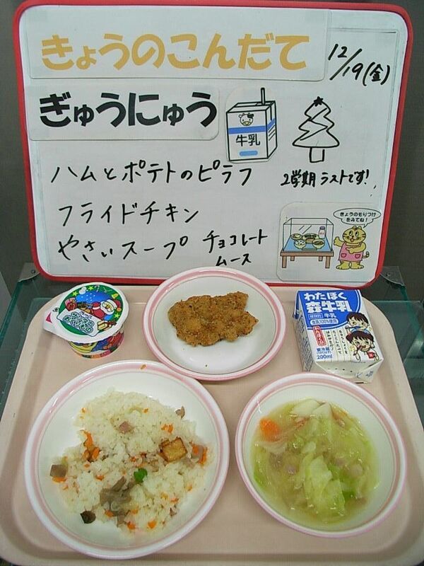 今日で2学期の給食は終わりです。2学期はしっかり給食が食べられましたか? 好き嫌いは少なくなりましたか? 自分の給食の食べ方についてふり返ってみましょう。今日は少し早いですが、クリスマスメニューにしました。みなさんの大好きなポテトの入ったピラフと野菜スープ、クリスマス定番のチキン、そしてデザートはチョコのムースです。今日はちょっぴり豪華な給食です。2学期もどのクラスもよく食べてくれました。ありがとう!給食室の調理員さんも喜んでいます。3学期もおいしい給食を届けます。楽しみにしていてくださいね。