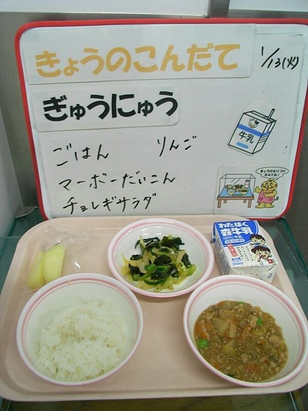 今日の主菜はマーボー大根です。冬野菜の代表「だいこん」をゆでて、マーボーのあんでからめました。だいこんは、胃を健康に保つ酵素をもっています。食物繊維も多く、体の中のいらないものを体の外に出す役目も果たしてくれる、胃腸薬のような野菜です。冬休みでちょっと食べすぎてしまった人は、特にすすんで食べたいですね。サラダの「チョレギ」とは、韓国語の方言で「浅漬けキムチ」のこと。日本では、浅漬け=野菜のみずみずしさを楽しむということで、生野菜のサラダとして広まったようです。