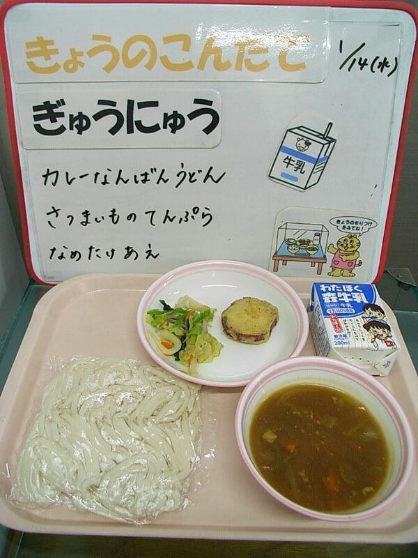 今日は「カレー南蛮うどん」です。カレーうどんに長ねぎが入ったものを「カレー南蛮」と呼びます。副菜は「さつまいもの天ぷら」です。小麦粉の衣をつけて揚げました。さつまいもは、調理すると甘みが増すことから「あまいも」とも呼ばれています。栄養はビタミンが豊富に含まれていたり、おなかの調子を整える食物繊維もたくさん含まれています。食感と色を楽しんで、うどんやなめたけ和えとあわせておいしく食べてくださいね。