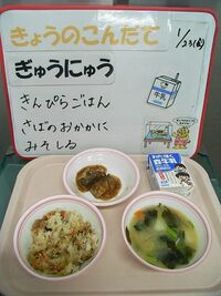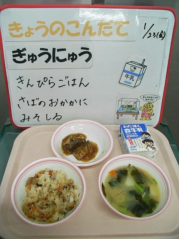 今日の給食はきんぴらご飯です。きんぴらに欠かせないごぼうは、世界中で広く知られている野菜ですが、根の部分を食べるのは日本だけという根菜です。腸の働きを整えたり、便秘を解消したりする重要な働きをもっている食物繊維がとても豊富です。ほかの国では、薬などに使われているそうです。空気が乾燥して、寒い日が続いています。手洗い、うがいもちろんですが、とにかくしっかり給食を食べて、自分を病気から守るために、強い体を作っていきましょう。