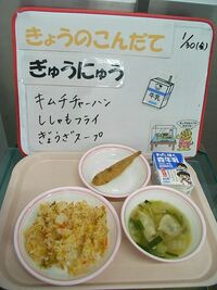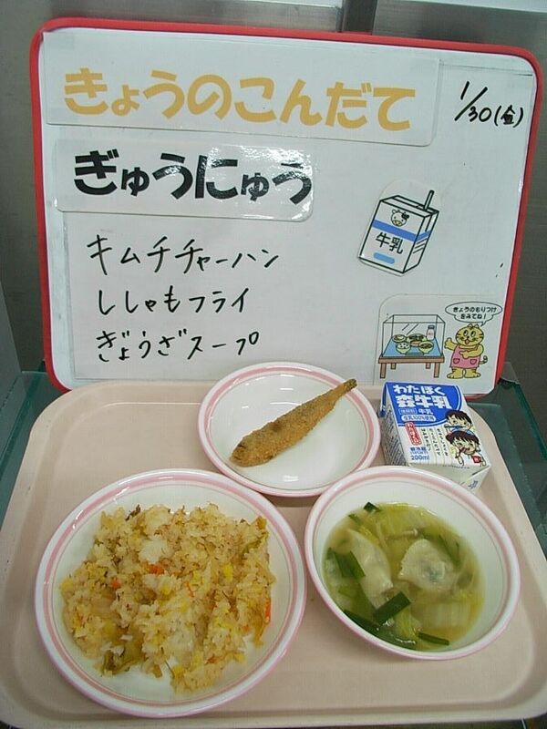 今日の給食は皆さんの大好きなキムチチャーハンです。豚肉と玉ねぎ、ピーマンなど具がたっぷりのこのチャーハン、岩槻小全員分のご飯は、たくさんの量で炒めきれないので、調味料を入れて炊いたご飯に、具を混ぜて作っています。2本の大きなしゃもじを使って、炊きたてのご飯と炒めた具を混ぜる作業は熱くて大変ですが、みなさんにおいしい給食を食べてもらうために調理員さんたちはがんばっています。ししゃもフライ、餃子スープと一緒に残さず食べてくれるとうれしいです。