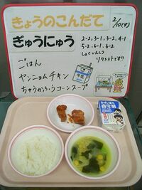 今日は2-2、3-1、3-2、4-1、5-2、6-1、6-2職員室リクエストの岩槻小学校一番人気の「ヤンニョムチキン」です。ヤンニョムチキンは、韓国の甘辛いフライドチキンで、デリバリーやファーストフードとしてよく食べられています。ヤンニョムとは、韓国語で調味料のことです。給食ではコチュジャン、トマトケチャップ、しょうゆ、砂糖、ごま油を使い、にんにくを効かせたタレにしました。コーンをたくさんいれた中華風の味付けにした「中華風コーンスープ」と一緒にもりもり食べてくださいね。