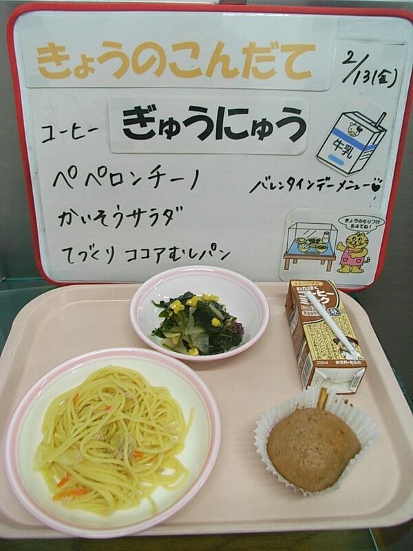 明日はバレンタインデー。いつもおいしい!と言ってたくさん食べてくれる皆さんに、給食室からの気持ちをこめて、岩槻小給食室手作りのココアむしパンです。朝から給食室で粉、砂糖、牛乳、卵を混ぜ合わせ、ひとつひとつカップに入れてオーブンで焼きました。4―2リクエストのコーヒー牛乳、5-1リクエストの海藻サラダ、主食のペペロンチーノと一緒に、おいしく食べてくださいね。
