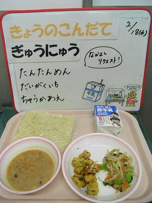 今日はいいお天気になりましたね。まだ少し風は冷たいですが、立春も過ぎ、もう春はそこまで来ています。この季節の変わり目を元気に過ごすために、引き続き、手洗い・うがいをして、給食もしっかり食べて、強い体作りを心がけましょう。今日はなかよしリクエストの、野菜たっぷりの担々麺が主食の給食です。しょうがとにんにくをたっぷり入れて、体の中から温まるようにしました。副菜の大学芋、中華和えと一緒にたくさん食べてくださいね。