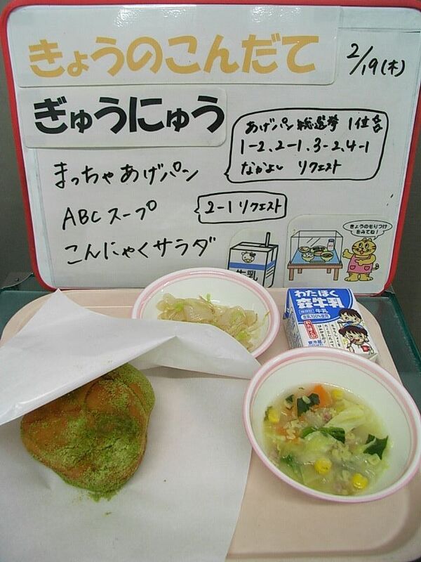 今日は給食で人気のあげパンです。(1-2、2-1、3-2、4-1、なかよしリクエスト)高温の油にパンを入れて、転がすようにしてこんがり揚げます。この揚げたてのパンに粉や砂糖をまぶしていきます。冷めてしまうとつかなくなってしまうので、アツアツのうちが勝負です。手袋をして、手早くつけます。あげパンは、おいしくなかったコッペパンをおいしく、しかもエネルギー(カロリー)を増やすために考えられたといわれます。今ではなつかしい給食でも一位に挙げられるほどの人気メニューになりました。今日は揚げパン総選挙1位の「抹茶味」にしました。みなさんは予想できましたか?2-1リクエストのABCスープと一緒に味わってくださいね。