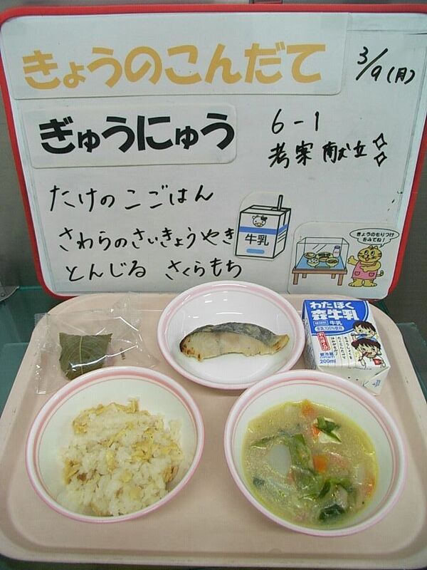 今月は、6年生が家庭科の授業で作成した献立が給食に登場します。今日はその第1回目、6年1組1班考案の「素材の味を極限まで出した調理員さんにすべてかかっているプレッシャー給食」です。主食はたけのこご飯、主菜は鰆の西京焼き、汁物は豚汁、デザートに桜餅です。季節や食べ物の旬がよく考えられている春らしい和食の献立ですね。和食とは、日本の歴史や環境の中で育まれた伝統的な料理と食文化のことです。2013年にはユネスコの無形文化遺産にも登録されました。和食は「旬」を大切にします。その時期に最も栄養価が高くおいしい食材を使うことで、日々の食事の中で四季の移ろいを感じることができるようになっています。給食室の調理員さんたちも気合いを入れて作りました。残さずにたべてくれるとうれしいです。