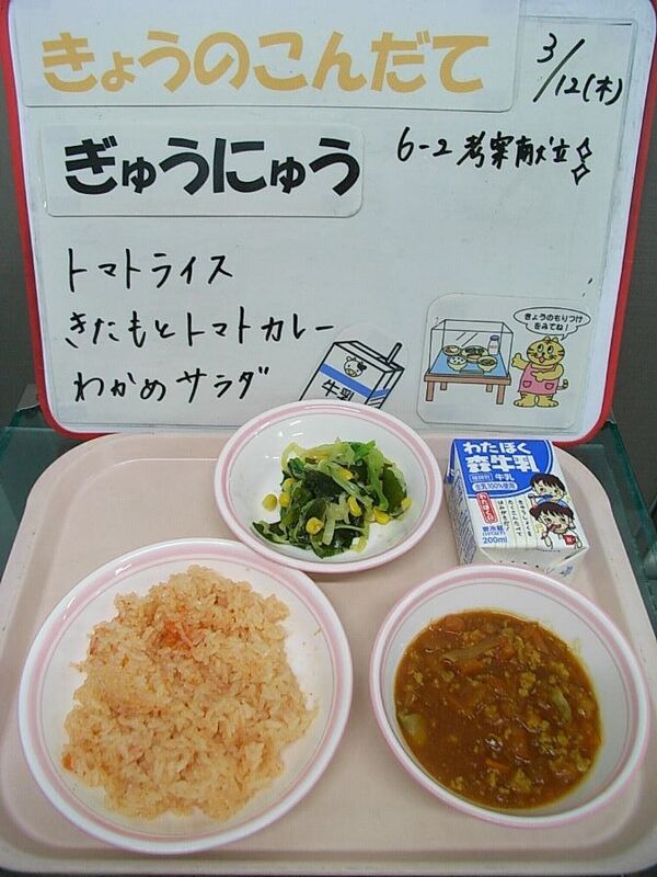 今日は6年生が家庭科の授業で考えた献立の第3弾で、6年2組6班考案の、「サイノクニランド給食」です。「トマトライス」、「北本トマトカレー」、「わかめサラダ」の献立です。「北本トマトカレー」は埼玉県の北本市のご当地B級グルメです。北本ではトマトの栽培が盛んなため、北本トマトカレーが作りはじめられました。北本トマトカレーには3つの定義があります。➀ライスをトマトで赤くすること。②ルーにトマトを使用すること。③トッピングにトマトを使用すること。給食ではできませんでしたが、実際にはトッピングがのっているようです。気になる人は実際に食べに行ってみるのもいいですね。