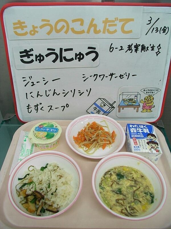 今週は暖かい日が続いきましたね。確実に春はすぐそこまで来ています。今日は6年生考案献立の第4弾、最終回です。6年2組4班考案の「沖縄料理風給食」です。「ジューシー」「にんじんシリシリ」「もずくスープ」「シークワーサーゼリー」の献立です。沖縄県の郷土料理であるジューシーは沖縄県の方言で雑炊を意味しますが、沖縄では通常の炊き込みご飯も水分の多い雑炊もすべて「ジューシー」とよんでいます。なかなか食べる機会のない沖縄料理ですが、いろいろな食べ物から栄養をもらって、季節の変わり目を元気に過ごしましょう。