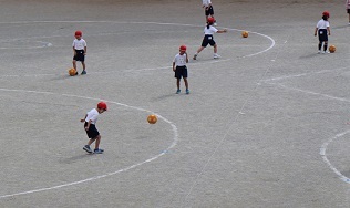 1年生ボールけりゲーム。足でボールを扱うのはなかなか難しい。