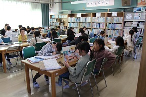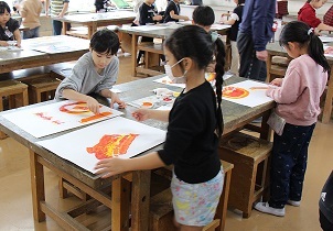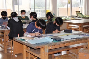 版画の仕上げをする6年生。作品紹介カードを書いています。色のグラデーションがきれいな作品でした。