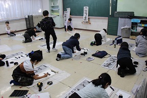 11/7(金)3年生初めての書初め。1枚目。どきどきで筆に墨を入れ書いてみました。