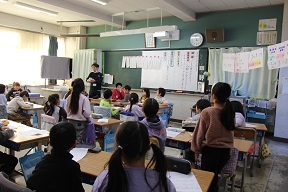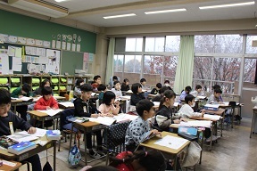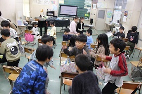 中学校のさわやか相談員の先生をゲストティーチャーに迎え、いのちの支え合いの授業をしている6年生です。