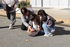 23タイムにちょっと実験。虫眼鏡で太陽の光を集めています。黒画用紙はどうなるかな。