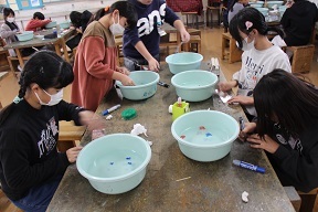 科学・アートクラブ。水性ペンを使って水に浮かぶアートを作成しています。