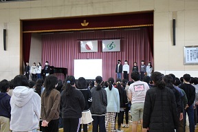 12/9(火)音楽朝会。音楽委員会が中心になって今月の歌を全校でうたいました。素敵な歌声になりました。