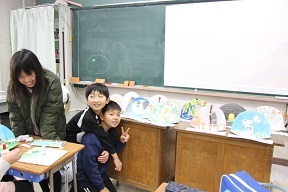図工の作品と一緒に写真とってください。とのことでハイチーズ。物語を立体にした作品です