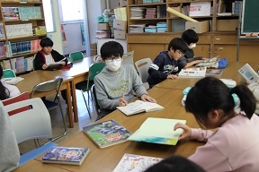 学校図書館では静かに本を読む4年生。本を紹介してくれる子もいます。
