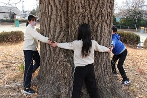 2月学校だよりに載せた、大イチョウの幹の周囲は?6年生4人に協力してもらいました。4人では少し足りませんでした。メジャーで測ると5m50cm。