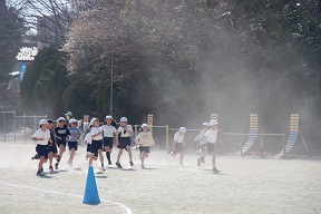 風はなかったのですが、校庭でみんなで走ると砂埃がまってしまいます。そんな中でも元気に走る3年生です。